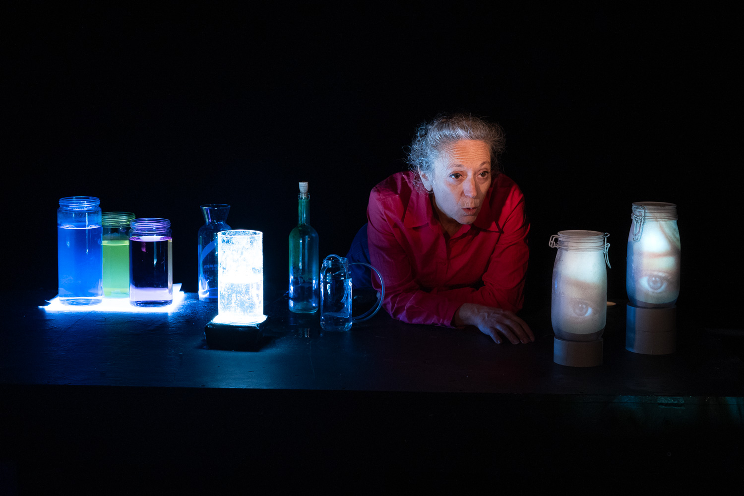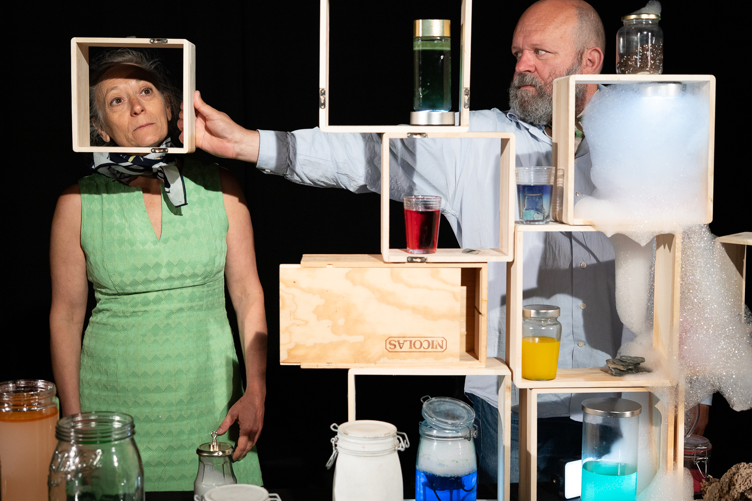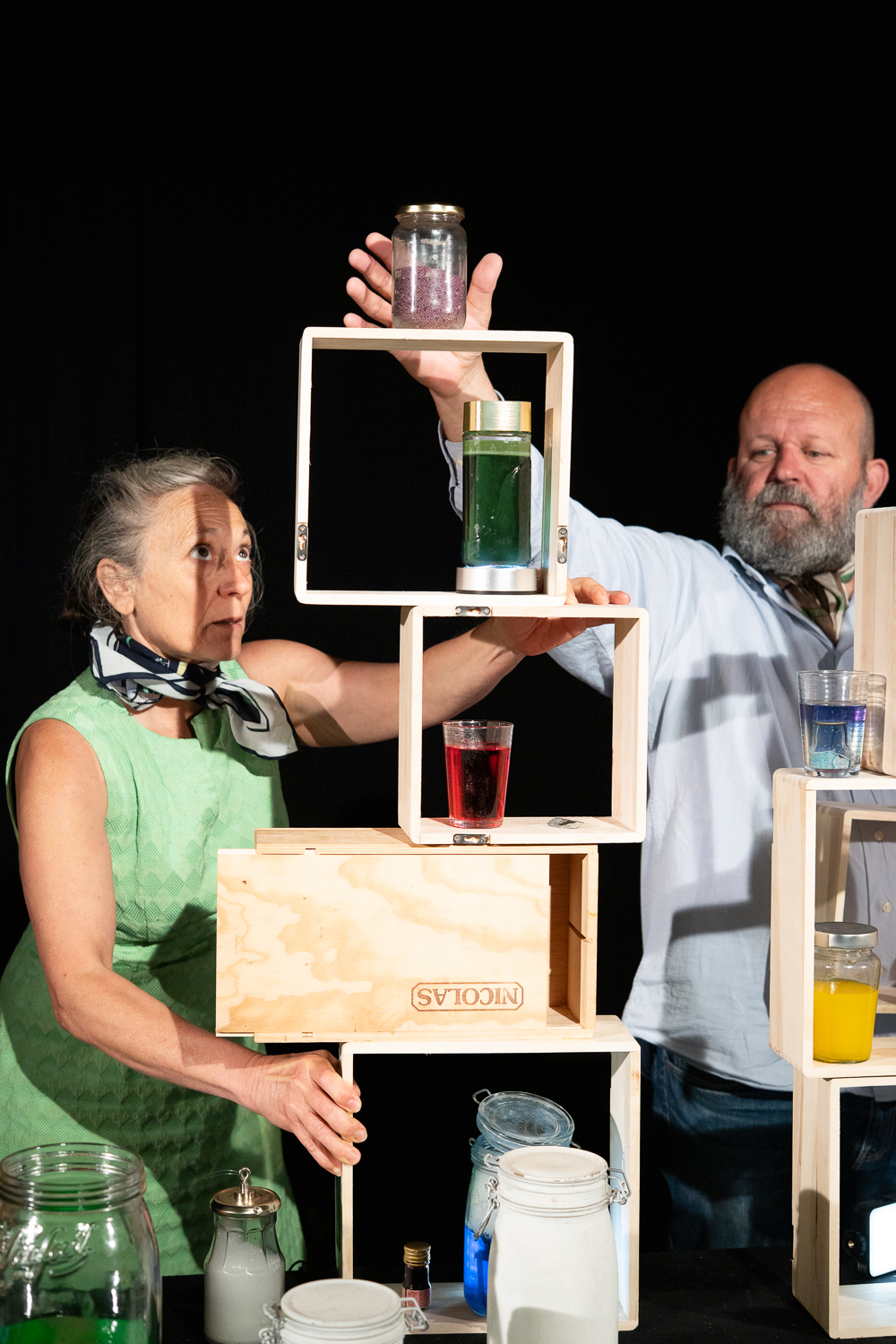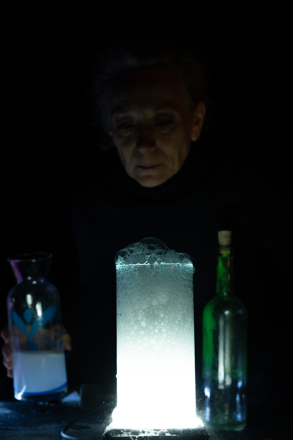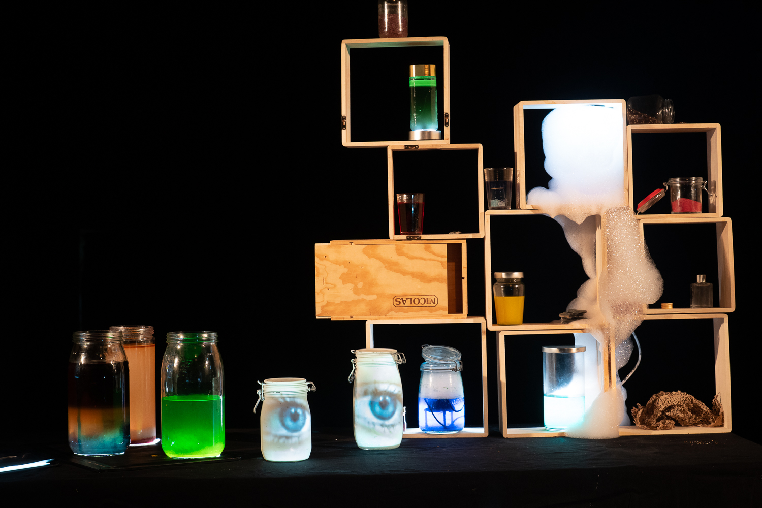 J’ai envie de travailler sur les fluides, des matières en mouvement. Du tissus peut-être, des voiles, mais aussi des liquides. J'imagine un meuble empli d’étagères avec des bocaux, des couleurs, des jeux de lumière mettant en valeur les liquides. Un peu comme un meuble d'apothicaire qui serait modulable en fonction des scènes et des images venant se confronter au récit.
